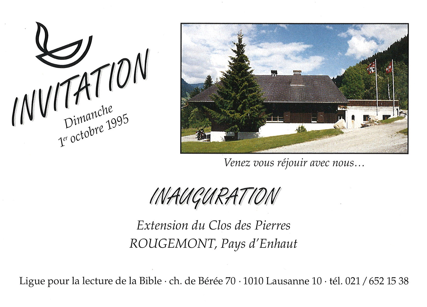 Construit en 1746, le Clos des Pierres est un très beau chalet situé en pleine nature. Situé sur le versant nord de la commune de Rougemont, dit Au Revers, il a été acquis par la Ligue pour la lecture de la Bible en 1964. C’était un bâtiment agricole, qui a été exploité par son ancien propriétaire encore environ 10 ans après sa vente.