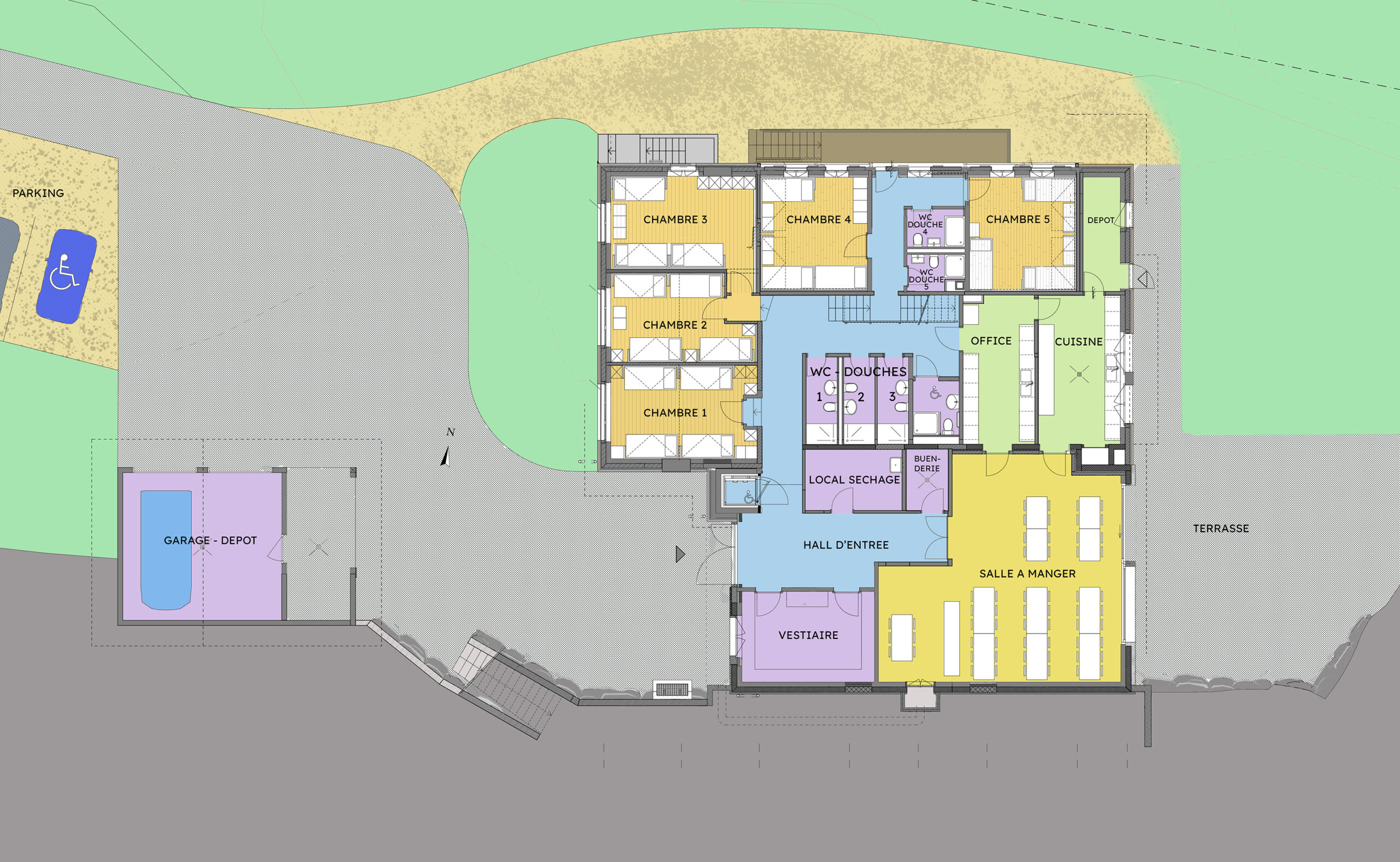 • 8 chambres équipées d’un nombre de lits variable (3 à 8 lits superposés rétractables) avec une capacité entre 28 et 49 lits.